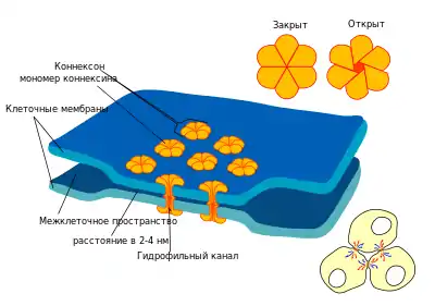 | Якорные контакты физически соединяют клетки между собой, обеспечивают целостность и прочность тканей, в частности эпителиальных и мышечных. При образовании контактов этого типа элементы цитоскелета соседних клеток как бы объединяются в единую структуру: с помощью специальных якорных белков они прикрепляются к внутриклеточной части белков кадгенринов, проходящих через плазматическую мембрану, и в межклеточном пространстве прикрепляются к кадгеринам соседних клеток. Различают два основных типа якорных контактов: адгезионные, объединяющие микрофиламенты соседних клеток; и десмосомы, в образовании которых принимают участие промежуточные филаменты. | Плотные (изоляционные) контакты обеспечивают максимальное сближение мембран соседних клеток, между которыми остается промежуток в 2-3 нм. Этот тип контактов чаще всего возникает в эпителии. Плотные контакты образуют непрерывные пояса вокруг каждой клетки, крепко прижимая их друг к другу и предотвращая протекание межклеточной жидкости между ними. Такие контакты необходимы, в частности, для обеспечения водонепроницаемости кожи. В формировании тесных контактов принимают участие белки окклюдины, клаудины и другие. | Щелевые (коммуникационные) контакты — это небольшие участки, на которых плазмалеммы соседних клеток приближены друг к другу на расстояние 2-4 нм и пронизаны белковыми комплексами — коннексонами. Каждый коннексон состоит из шести трансмембранных белков коннексинов, которые окружают небольшие гидрофильные поры диаметром в 1,5 нм. Через эти каналы от одной клетки к другой могут проходить ионы и другие небольшие гидрофильные молекулы. Таким образом происходит общение между соседними клетками. Щелевые контакты характерны для большинства тканей животного организма: в частности, эпителиальной, соединительной, сердечной мышцы, нервной (где формируют электрические синапсы) и др. |