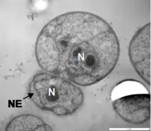 Распространено и наличие двух ядер в клетках мицелия у грибов (особенно у образующих микоризу[74]) и в клетках сближаемых в современных классификациях с грибами микроспоридий. Данное явление известно как дикарион, или диплокарион[75]. Встречающиеся у многих грибов несептированные гифы также, по существу, представляют собой гигантские многоядерные клетки[76].