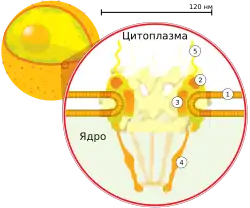 ![]() Поперечный разрез ядерной поры. Цифрами обозначены: 1 — ядерная оболочка, 2 — внешнее кольцо, 3 — спицы, 4 — корзина, 5 — филаменты |