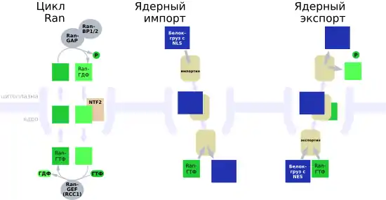 Выход из ядра и вход в ядро крупных молекул контролируется ядерными порами. Хотя малые молекулы могут проникать в ядро без всякой регуляции, макромолекулы — такие, как белки и РНК — должны связаться с кариоферинами для транспорта в ядро (импортинами) и из ядра (экспортинами). Белки, которые должны быть транспортированы из цитоплазмы в ядро, содержат особую аминокислотную последовательность, известную как сигнал ядерной локализации, с которой связываются импортины. Аналогичным образом белки, которые должны выйти из ядра, содержат сигнал ядерного экспорта, распознаваемый экспортинами. Способность импортинов и экспортинов переносить свой груз регулируется ГТФазами — ферментами, которые гидролизуют ГТФ с высвобождением энергии[13]. Ключевая ГТФаза ядерного транспорта — Ran, которая может связываться с ГТФ или ГДФ, в зависимости от своего местонахождения (в ядре или в цитоплазме). В ядре взаимодействие Ran-ГТФ с импортином вызывает конформационные изменения в последнем, так что он отделяется от переносимого груза. Образованный комплекс Ran-ГТФ и импортина транспортируется в цитоплазму, где белок RanBP отделяет Ran-ГТФ от импортина. Отделение от импортина позволяет белку GAP связаться с Ran-ГТФ и катализировать гидролиз ГТФ до ГДФ. Далее комплекс Ran-GDP распознаётся белком NUTF2, который возвращает его в нуклеоплазму. В ядре белок GEF заменяет ГДФ на ГТФ, образуя Ran-ГТФ и замыкая цикл[52].