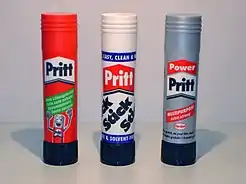 В 1969 немецкой компанией Henkel клеящий карандаш был изобретен под влиянием конструкций поворотного чехла помады. Продукт был выпущен под торговой маркой "Pritt Stick", и к 1971 продавался в 38 странах, а к 2001 в 121 стране.[1] Первый клеящий карандаш для материалов, отличных от бумаги (дерево, стекло, некоторые виды пластика) был выпущен под торговой маркой "PowerPritt" в 2003. [2]