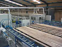 - Отсортированные (по размерам и качеству) доски высушиваются в специальных камерах до эксплуатационной влажности, (8—18 %, в зависимости от типа бруса и применяемого клея).