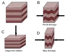 Кливаж особенно хорошо заметен в так называемых кровельных сланцах — глинистых сланцах с толщиной пластин до доли миллиметра; в известняках и песчаниках, имеющих более толстые и грубые пластины, проявляется не так заметно. Кливаж происходит под воздействием воды, выделяемой минералами при метаморфизме горных пород, и перекристаллизации минералов в условиях сжатия, перпендикулярного по отношению к их осевым плоскостям, под влиянием чего в земной коре образуются линейные складки. Сжатие кристаллов минералов происходит в плоскости, которая перпендикулярна оси сжатия, что приводит к образованию внутренней ориентированной плоскопараллельной структуры породы, а их плоская ориентировка принимает направление, также перпендикулярное осевым плоскостям, вследствие чего порода приобретает свойство раскладываться на пластины в том же направлении. Если имеет место сильная перекристаллизация, когда размер плоских ориентированных кристаллов превышает 1 миллиметр, то это приводит к появлению у породы свойства сланцеватости.