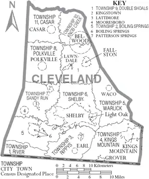 Округ делится на одиннадцать тауншипов: Ривер, Бойлинг-Спрингс, Риппи, Кинг-Маунтин, Ворлик, Шелби, Сэнди-Рун, Полквилл, Дабл-Шолс, Ноб-Крик, Касар.