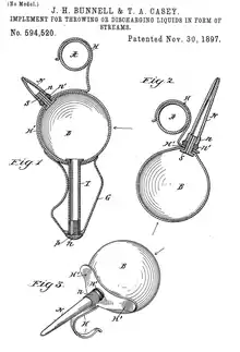 - US Patent № 594,520. J.H. Bunnell & T.A. Casey. Implement for throwing and discharging liquids in form of streams. Patented Nov. 30, 1897..