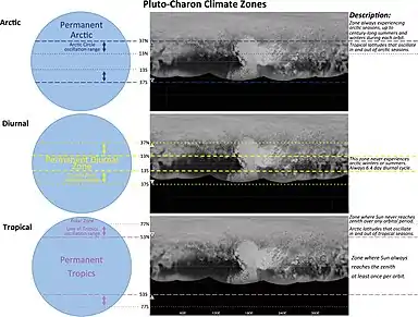 Климатические зоны на карликовой планете Плутон представляют собой необычный набор климатических зон вследствие нетипичного для планет расположения оси[1]. Было выделено пять климатических зон: тропики, арктическая зона, тропическая арктическая зона, суточная область и полярная область[1]. Климатические зоны выделены на основе астрономических методов определения границ или на основе определения субсолнечных широт, не связанных с циркуляцией атмосферы на карликовых планетах. Харон, крупнейший спутник Плутона, находится в состоянии приливного захвата с Плутоном, поэтому наборы климатических зон у двух небесных тел совпадают[1].
