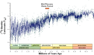 Концентрация углекислого газа в среднем плиоцене оценивается примерно в 400 ppmv от соотношения 13 C/ 12 C в органическом морском веществе и устьичной плотности окаменелых листьев , снижение уровня углекислого газа в позднем плиоцене, возможно, в значительной степени способствовало глобальному охлаждению и началу оледенения Северного полушария.[12][13] Для планеты такое низкое содержание углекислоты не является нормой, обычно углекислоты было больше 600 единиц.