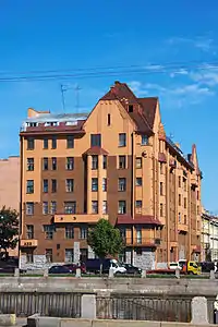 - дом 9/159 — яркий образец северного модерна, шестиэтажный дом Капустина, 1910—1912 годы, архитектор А. Ф. Бубырь (№ 159 по набережной реки Фонтанки). Квартира 53 в этом доме — одно из мест действия романа «Лик чёрной пальмиры»[1].