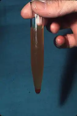 - муть, связанная с наличием гноя, не исчезает ни от нагревания, ни от добавления кислот, а добавление щёлочи вызывает образование густой стекловидной массы.