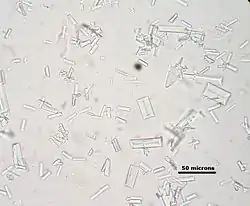 - Мочевая кислота — кристаллы разнообразной формы (ромбической, шестигранной, в виде бочонков, брусков и другие), окрашенные в янтарный, красно-бурый или желтовато-бурый цвет, часто прокрашиваются посторонними веществами. Макроскопически кристаллы в осадке мочи имеют вид золотистого песка.