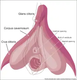 Клитор, согласно исследованиям австралийского уролога, доктора Хелен О’Коннелл, состоит из двух пещеристых тел клитора (лат. corpus cavernosum clitoridis), головки клитора (лат. glans clitoridis), ножек клитора (лат. crus clitoridis) и двух луковиц преддверия влагалища (иначе клиторальные луковицы) (лат. bulbus vestibuli vaginae)[34]. Волокнистые мембраны, окружающие пещеристые половинки тела клитора, сходятся над срединными поверхностями, образуя перегородку, к которой прикрепляются эластичные и гладкомышечные волокна. Пещеристое тело клитора разделяется над уретрой на две ножки клитора, которые огибают с двух сторон уретру и вагину, и оканчиваются двумя луковицами образуя клитороуретровагинальный комплекс. Тело клитора связано с седалищно-лобковой ветвью (лат. ramus ischiopubicus) корнем, в то время как две небольшие седалищно-пещеристые мышцы (лат. musculus ischiocavernosus) прикрепляются к ножкам клитора во внутренней части головки и пещеристых тел, образуя комплекс нервных окончаний. Кровоснабжение клитора обеспечивают ветви внутренней срамной артерии (лат. arteria pudenda interna). Приток артериальной крови и венозный отток одинаковы с мужским половым членом.[11]