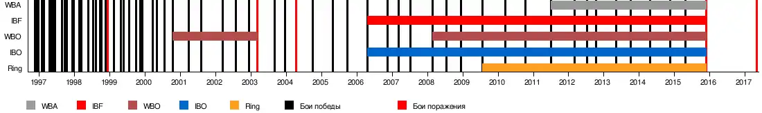 | Чемпионский пояс | WBO (2000—2003, 2008—2015), IBF (2006—2015), IBO (2006—2015), WBA (2011—2015) |