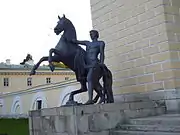 - В первой группе животное покорно человеку — обнажённый атлет, сжимая узду, сдерживает вздыбленного коня. И животное, и человек напряжены, борьба нарастает.