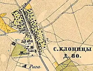 КЛОПИЦЫ — деревня, православных — 405, протестантов — 87, мужчин — 207, женщин — 285, обоего пола — 495. (1897 год)[23]