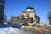 В начале XIX века, при игумене Герасиме (Гайдукове), собор был перестроен так, что потерял всю свою неповторимость — палаточное завершение (заменено на четырёхскатное) и приделы, из трёхглавого он стал пятиглавым. При реконструкции трапезной церкви в бывшей трапезной палате устроили 2 придела. Несколько ранее были построены каменная ограда, братские кельи и новая колокольня (1805). В годы Великой Отечественной войны трапезная церковь была сильно разрушена. В 1960-е гг. собор был законсервирован, а Никольская церковь по-прежнему пребывает в руинах.