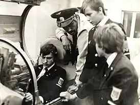 - Бессменный директор Клуба юных лётчиков имени Ф. А. Цандера, бортинженер самолета Ту-154Б, Виктор Петрович Талпа (второй справа) вместе с курсантами и выпускниками в штабе Клуба в 1980-х годах (Фото и статья в газете о КЮЛ имени Ф.А.Цандера).
