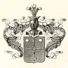 На щите дворянский коронованный шлем. Нашлемник: три страусовых пера. Намёт на щите голубой, подложен золотом.