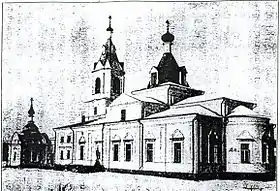 Первым храмом в монастыре стала деревянная холодная однопрестольная церковь, освящённая во имя Казанской иконы Божией Матери. Церковь находилась рядом с монастырём, а не непосредственно на его территории. Рядом с церковью была построена деревянная колокольня. Построены они были на средства А. И. Путиловой. Храмовые праздники отмечались 8 июля и 22 октября[1].