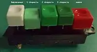 ![]() Выключатель освещения | ![]() Переключатель режимов напольного вентилятора | ![]() Тумблер (переключатель электрических цепей в радиоэлектронной аппаратуре) |