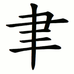 Древняя идеограмма изображала руку, держащую некое орудие письма, и черточку - знак, который им написан. Эта идеограмма стала основой иероглифа, который в современном языке обозначает «орудие письма (резец, бамбуковый карандаш, писчая кисть)».