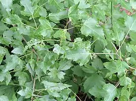 Листья плотные, трехлопастные, сверху тусклые, сизо-зеленые, с нижней стороны более светлые размером 4,5 х 3,2 см. Листовые пластинки яйцевидные или треугольно-яйцевидные, 2—5 см длиной и 1—3,5 см шириной. Цветки желтоватые, в густых, многоцветковых соцветиях до 6 см длиной и около 5 мм в диаметре.