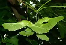 Плод представляет собой двойную крылатку, распадающуюся на два односемянных невскрывающихся плодика, с двумя длинными (3,5—5,5 см) расходящимися под тупым углом или почти горизонтально крыльями, которые способны уносить семя на большое расстояние. Семена голые, с крупным зелёным свёрнутым зародышем, без эндосперма, приплюснутые, созревают в конце лета и могут оставаться на дереве в течение зимы. Семенная кожура тонкая[7]. Плодоношение обильное и ежегодное[5], в России — в сентябре.