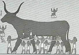 ![]() Богиня неба Нут в облике коровы, поддерживаемая восемью божествами Хех | |