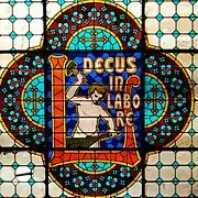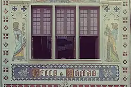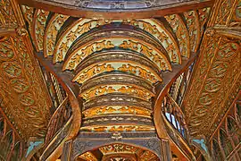 В интерьере, где присутствуют детали ар-деко, доминирует причудливая раздваивающаяся лестница с резной оградой, соединяющая первый этаж с галереей на втором. В центре потолка — витраж размером 8 на 3.5 метра с монограммой владельцев и их девизом «Честь в труде» (лат. «Decus in Labore»). Декоративные элементы потолка выполнены окрашенной штукатуркой, имитирующей резное дерево.