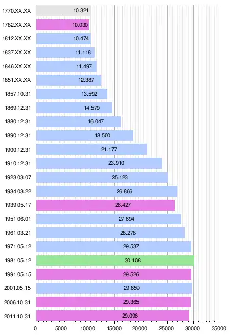 Изменение численности населения на территории судебного округа в 1782-2011 гг. по данным налоговых, поместных, военных, церковно-приходских, судебных (1782—1863 гг.) и общенациональных (в том числе пробных и регистрационных) переписей за 1869—2011 гг.[13][14]