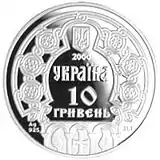 На аверсе: в обрамлении орнамента древнерусской напрестольной арки-оберега XII в. — изображение малого государственного герба Украины, надписи «УКРАЇНА 10 ГРИВЕНЬ 1998», обозначение пробы и массы металла — «Ag 925 31,1». На реверсе: князь Кий, изображения фигур трёх братьев и женщины (Кий, Щек, Хорив и Лыбедь), на заднем плане — крепость на холме. Надписи: «КИЙ КНЯЖА УКРАЇНА». |