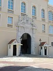 Оноре II сменил его внук, князь Луи I. Новый князь обладал утончёнными манерами и проводил со своей женой много времени при французском дворе, где он пользовался необычной привилегией быть одновременно главой иностранного государства и пэром Франции. Находясь под впечатлением от дворцов французского короля, нанявшего архитектора Жана Дюсерсо для выполнения работ по реконструкции дворца в Фонтенбло, Луи I использовал Фонтенбло как источник вдохновения для улучшения своего дворца в Монако. Таким образом, он ответственен за две наиболее заметные черты дворца: вход — огромную арку в стиле барокко, увенчанную разорванным фронтоном с гербом семьи Гримальди — и ещё более запоминающуюся лестницу в форме двойной подковы, построенную по образцу лестницы в Фонтенбло[11]. Говорят, что тридцать ступеней, составляющих лестницу, были высечены из одного блока каррарского мрамора[12]. Архитрав нового входа и подковообразная лестница были спроектированы Антуаном Григхо, архитектором из Комо[13].