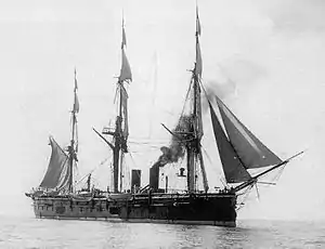 | Двигатели | 1 горизонтальная паровая машина прямого расширения (завод Берда), 6 котлов (с 1875 — 8); Полное корабельное парусное вооружение (2200 м²) |