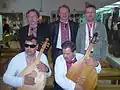 Главы (панмайстры) кобзарских цехов (верхний ряд слева направо) — М. Хай (Львовский), М. Товкайло (Киевский) и К. Черемский (Харьковский цех) с первыми незрячими исполнителями Олександром Триусом и Лайошом Молнаром (нижний ряд, слева направо)