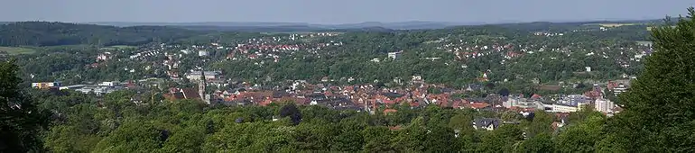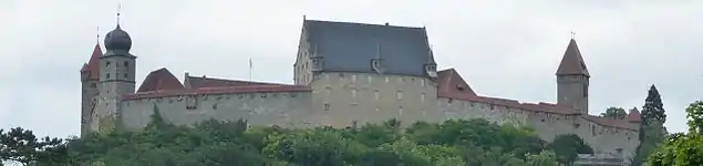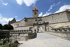 Крепость Фесте[16] возвышается на 170 метров над городом на вершине холма Фестунгсберг и принадлежит к числу самых больших и хорошо сохранившихся крепостных сооружений Германии. Крепость была впервые документально упомянута в 1225 году. В 17 веке она была существенно усилена и достроена. Крепость была долгое время постоянным местом проживания кобургских герцогов, в ней находятся сохранившиеся коллекции герцогов — картины, оружие, изделия из стекла. Украшением собрания картин являются несколько работ Лукаса Кранаха Старшего.