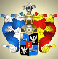 В первой и четвёртой частях, в голубом полях, видна в серебряных латах рука с саблею, выходящая из облака, в правом верхнем углу означенным (польский герб Малая Погоня). Во второй и третьей частях, в чёрном поле, находится по одному белому одноглавому орлу с распростёртыми крыльями.