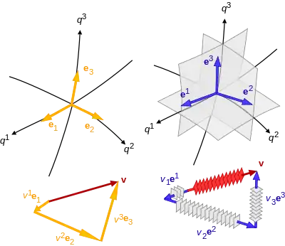 Пространство всех линейных функционалов, отображающих векторы в числа, называют сопряжённым пространством . Оно также является векторным пространством той же размерности, что и основное пространство. В этом пространстве также можно определить базис. Обозначим элементы базиса сопряжённого пространства с верхним индексом . Любой функционал можно представить в этом базисе через координаты, которые будем обозначать нижними индексами. Тогда, применяя правило Эйнштейна, можем записать: , то есть любой линейный функционал можно записать просто набором чисел , как обычный вектор (за исключением нижнего расположения индекса).