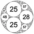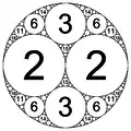 - Положительная кривизна указывает на то, что все другие круги касаются этой окружность снаружи. Этот круг находится внутри круга с отрицательной кривизной.