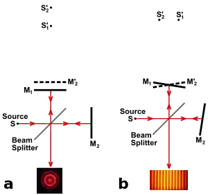 Проиллюстрируем понятие временной когеретности на примере эксперимента с интерферометром Майкельсона[1]. Предположим, что источник S испускает квазимонохроматический свет, то есть ширина полосы частот мала по сравнению со средней частотой. Предположим, что путь при отражении от зеркала на расстояние 2d длиннее, чем при отражении от зеркала . Тогда разность хода .