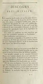 На торжественном пленарном заседании Государственного совета 28 мессидора IX года (17 июля 1801 года), посвящённом открытию предварительных дискуссий по проекту Кодекса, с докладом от имени всех членов кодификационной комиссии выступил Порталис. В этом случае он действовал не только как один из авторов проекта, но и как член законодательного департамента Совета, что придавало его речи особую значимость. Основой выступления Порталиса являлось «Вступительное слово» к проекту Кодекса, написанное им лично. В этом документе, обозревая проделанную кодификационной комиссией работу, Порталис представил своё видение французского гражданского права и системы законодательства[76].