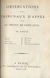 Замечания апелляционных судов к проекту Гражданского кодекса были подготовлены специально назначенными комиссиями соответствующих судов и в большинстве своём касались режима имущественных отношений между супругами и правил наследования. При этом многие суды высказывали критические соображения в отношении положений предварительной книги проекта, поскольку она задавала тон всему Кодексу. В частности, апелляционный суд Парижа предлагал начать Кодекс с определения понятия «закон» и с перечисления отдельных видов законов, обращая внимание Государственного совета на то, что первый титул («Общие определения») совсем не даёт «точного и общего определения законодательства»[70].