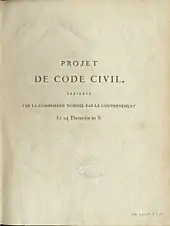 Спустя четыре месяца комиссия Тронше доложила Наполеону о завершении подготовки проекта Кодекса. Первого плювиоза IX года (21 января 1801 года) проект был напечатан вместе со «Вступительным словом», написанным Порталисом. На этом этапе документ насчитывал 2280 статей и включал четыре книги: предварительную книгу «О праве и законах», книгу первую «О лицах», книгу вторую «Об имуществе и различных видоизменениях собственности» и книгу третью «О различных способах приобретения права собственности». Нумерация статей в проекте была потитульной, а не сплошной; это объяснялось тем, что комиссия фактически разрабатывала 36 отдельных законов, которые были объединены в Кодекс специальным законодательным актом лишь после их принятия. О процессе подготовки Кодекса кратко писал де Мальвиль[58][59]: