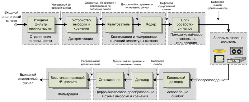Делается это следующим образом: непрерывный аналоговый сигнал «режется» на участки, с частотой дискретизации, получается цифровой дискретный сигнал, который проходит процесс квантования с определенной разрядностью, а затем кодируется, то есть заменяется последовательностью кодовых символов. Для записи звука в полосе частот 20-20 000 Гц, требуется частота дискретизации от 44,1 и выше (в настоящее время появились АЦП и ЦАП c частотой дискретизации 192 и даже 384 кГц). Для получения качественной записи достаточно разрядности 16 бит, однако для расширения динамического диапазона и повышения качества звукозаписи используется разрядность 24 (реже 32) бита.