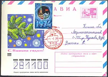 1. Филателистический конверт с новогодней маркой (1973) и новогодним спецгашением, сделанным на Московском международном почтамте 1 января 1974 года