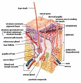 - Дерма представляет собой соединительную ткань, в которой выделяются 2 слоя — сосочкового, на котором располагаются многочисленные выросты, содержащие в себе петли капилляров и нервные окончания, и сетчатого, содержащего кровеносные и лимфатические сосуды, нервные окончания, фолликулы волос, железы, а также эластические, коллагеновые и гладкомышечные волокна, придающие коже прочность и эластичность.