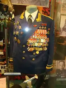 - Трижды Герой Советского Союза (04.02.1944, № 1472; 19.08.1944, № 36; 18.08.1945, № 3).