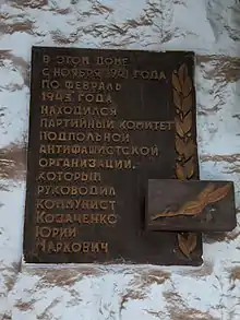 - Вказівна дошка на честь керівника підпільної групи Козаченка Ю. М. (укр.)