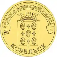 20 июля 2020 года Центральный банк Российской Федерации выпустил в обращение монету из недрагоценного металла номиналом 10 рублей «г. Козельск, Калужская область» серии «Древние города России»[41]. До этого Центробанк выпустил памятную монету номиналом 10 рублей из серии «Города воинской славы», на реверсе которой изображён герб города Козельска.