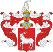 В щите, имеющем красное поле, изображён серебряный козёл, идущий в правую сторону. Щит увенчан обыкновенным дворянским шлемом и с дворянской на нем короной, на поверхности которой виден до половины выходящий козёл. Намёт на щите красный, подложенный серебром.