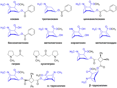 Кокаин, как и циннамилокаин и руксиллин, представляет собой метиловый эфир бензоилированного экгонина. Все три алкалоида при гидролизе распадаются до экгонина, то есть данное вещество является общим для всех трёх алкалоидов «скелетом».