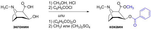 - бензоилированием путём нагревания экгонина в смеси с бензойным ангидридом и последующим метилированием метилйодидом или диметилсульфатом.